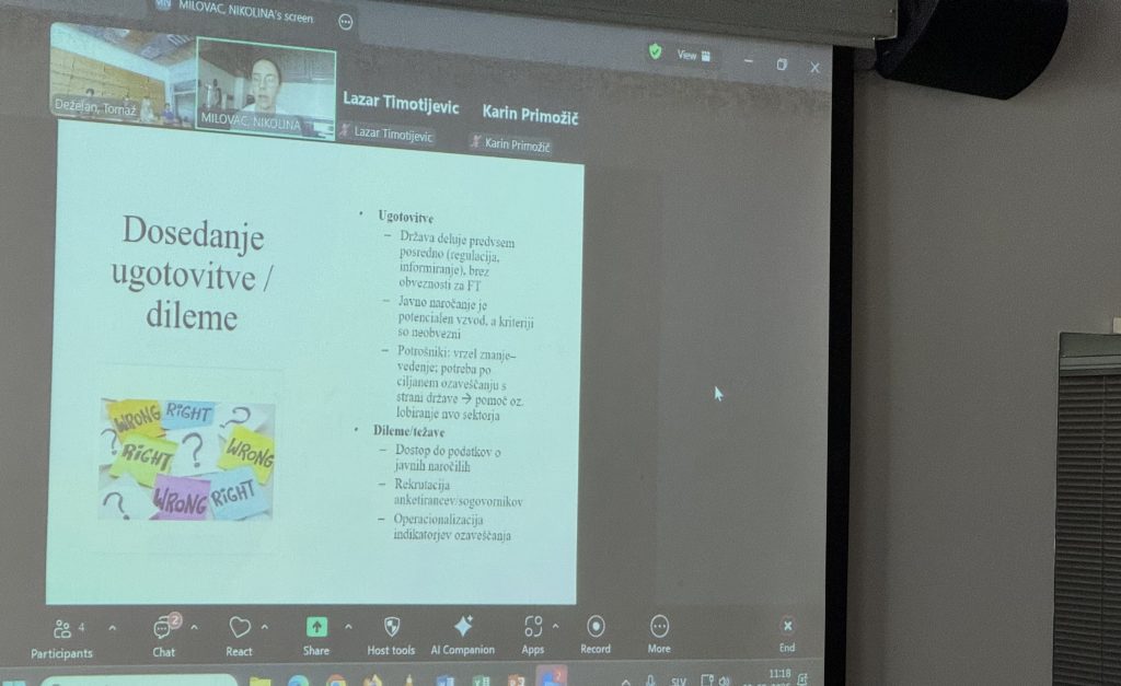 Zaključni dogodek ter predstavitev rezultatov smo izvedli na Fakulteti za družbene vede, v četrtek, 28. 8. 2025, kjer so študenti predstavili svoje raziskovalne rezultate. Po vsaki predstavitvi so o ugotovitvah razpravljali s svojimi kolegi ter obema mentorjema. Na koncu smo skupaj oblikovali predloge ter načrt za nadalnje korake.
